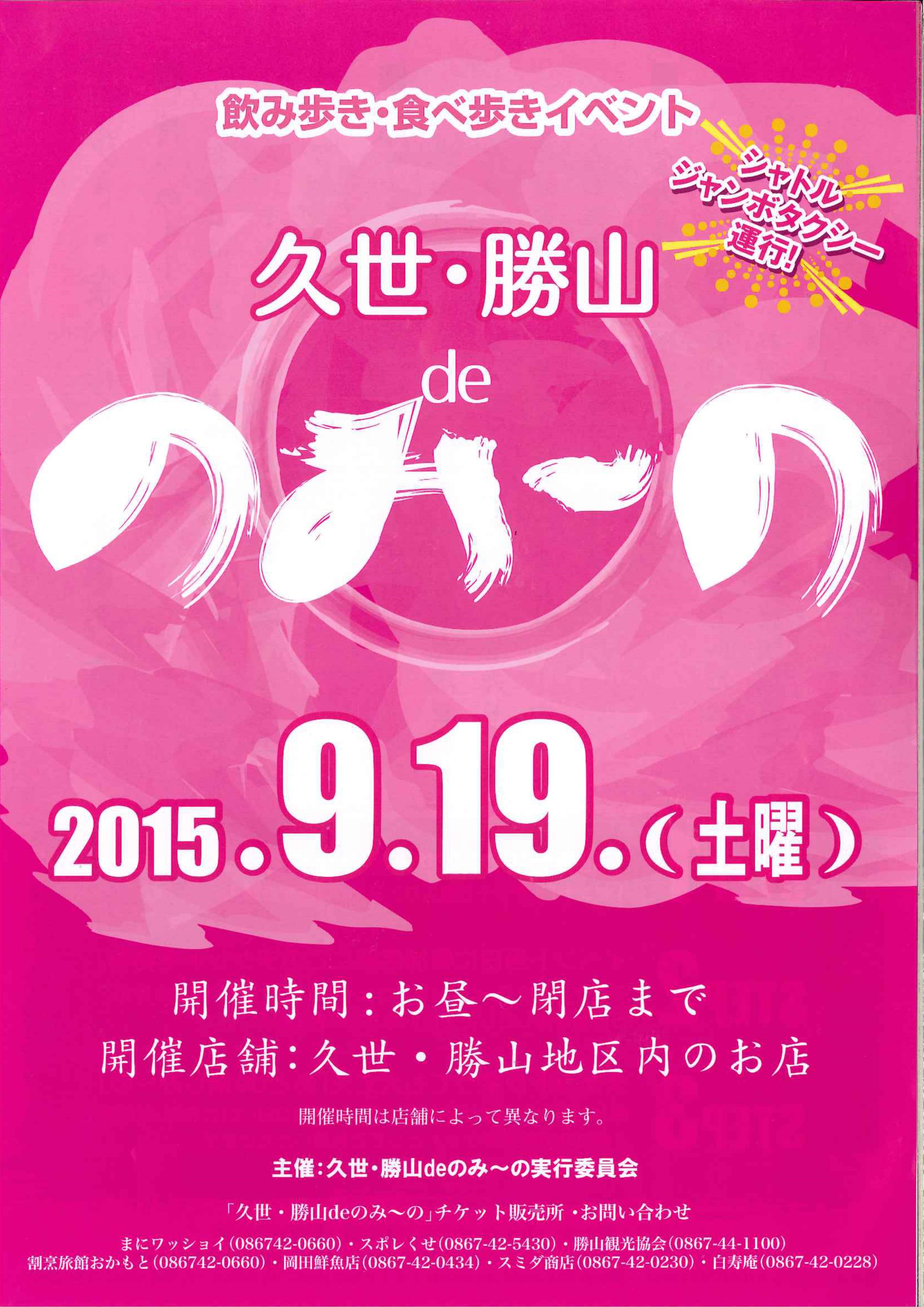| 開催内容 | 大好評の飲み歩き・食べ歩きイベントが規模を拡大して、久世・勝山で開催いたします! 当日は久世~勝山間を30分間隔のシャトルジャンボタクシーも運行してお気軽に飲み歩きが楽しめます。 <チケット販売所・お問合せ> |
