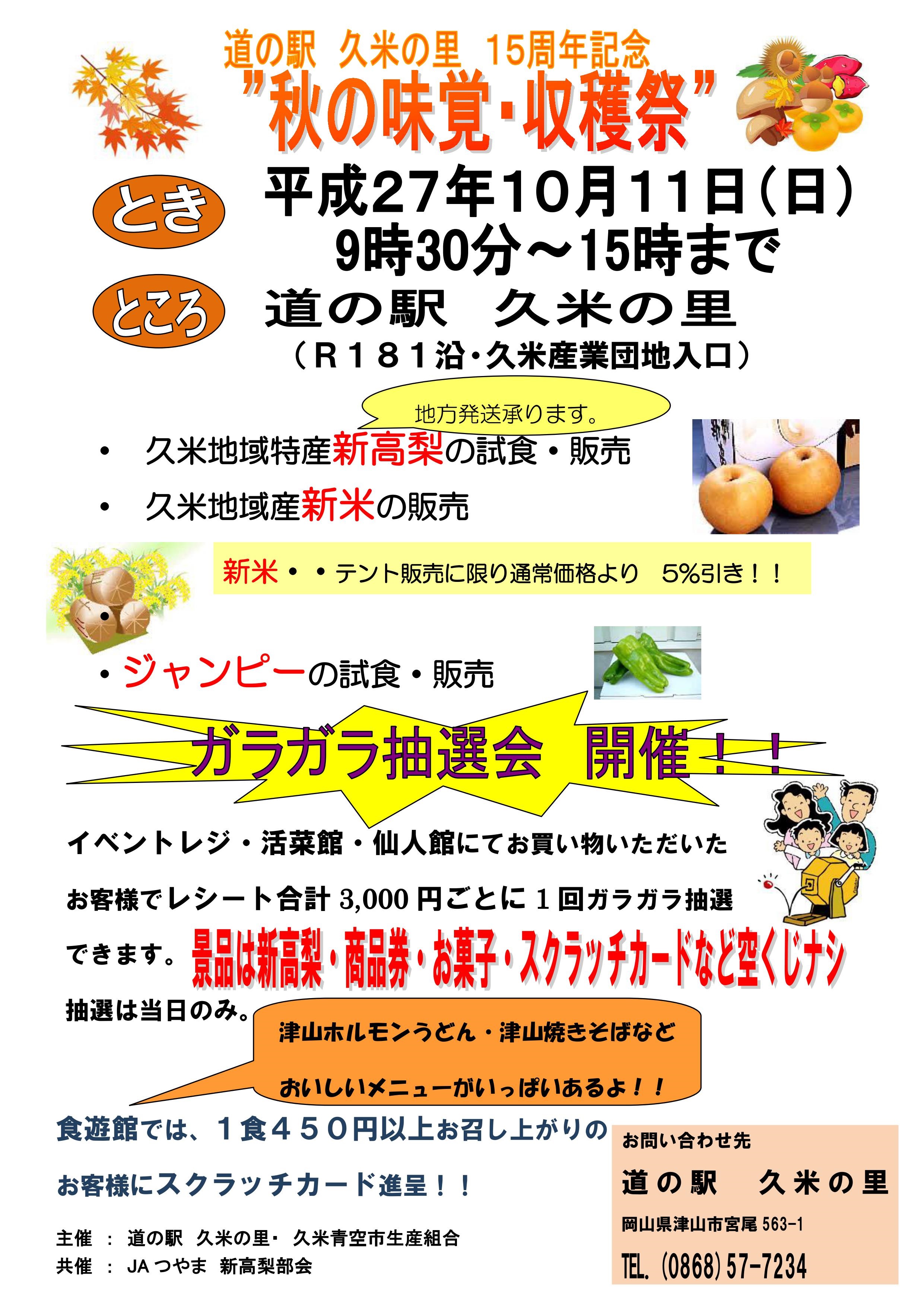 | 開催内容 | 久米地域特産の新高梨の試食販売、久米地域産の新米の販売、ジャンピーの試食など。 お買い物をいただいたお客さま、合計3,000円ごとに1回ガラガラ抽選ができます。空くじナシ♪ |
